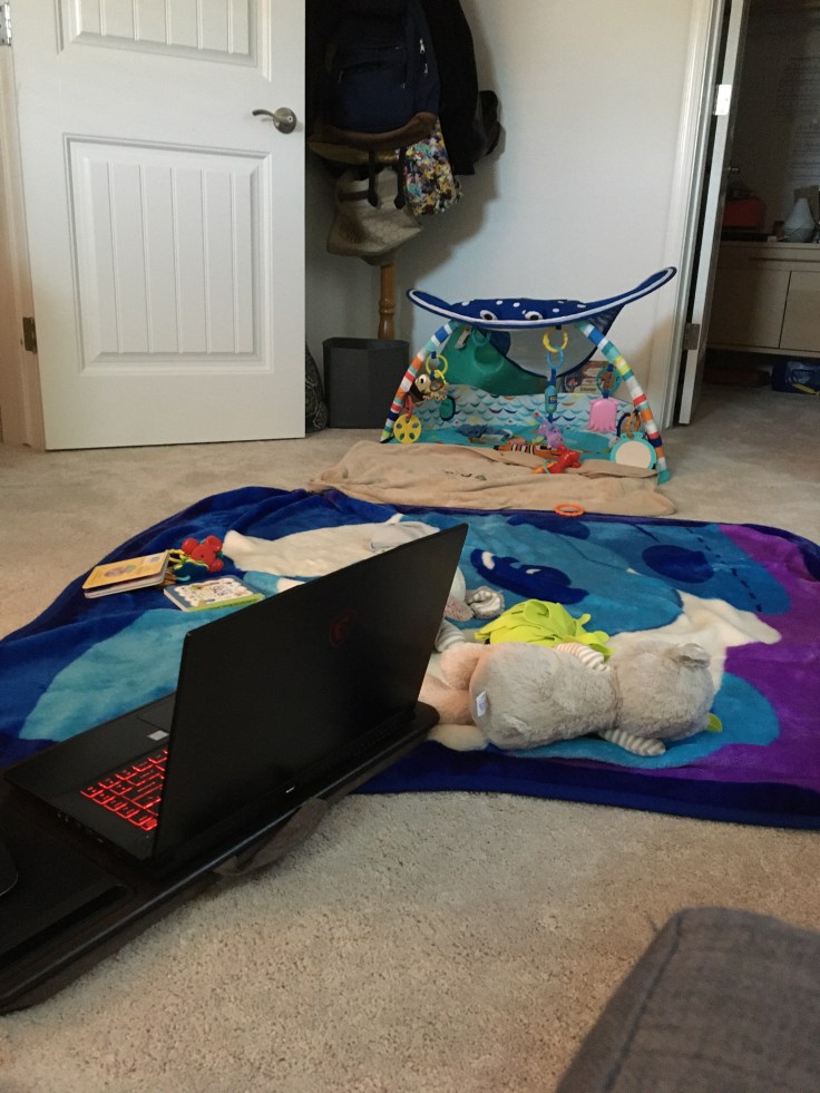 This is my office, now. A comfy floor and lap desk. Part playroom, part workspace. Currently, I’m finishing up a freelance article while my boys play underneath a Finding Nemo playmat, rolling around to grab their toys and books on a Blue’s Clues blanket we’ve spread out for them. Their stuffed dog and bear, DD and KB, are beside them. And yes, that is a baby arm.