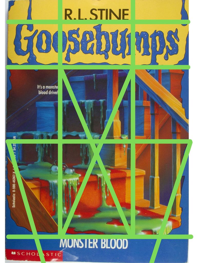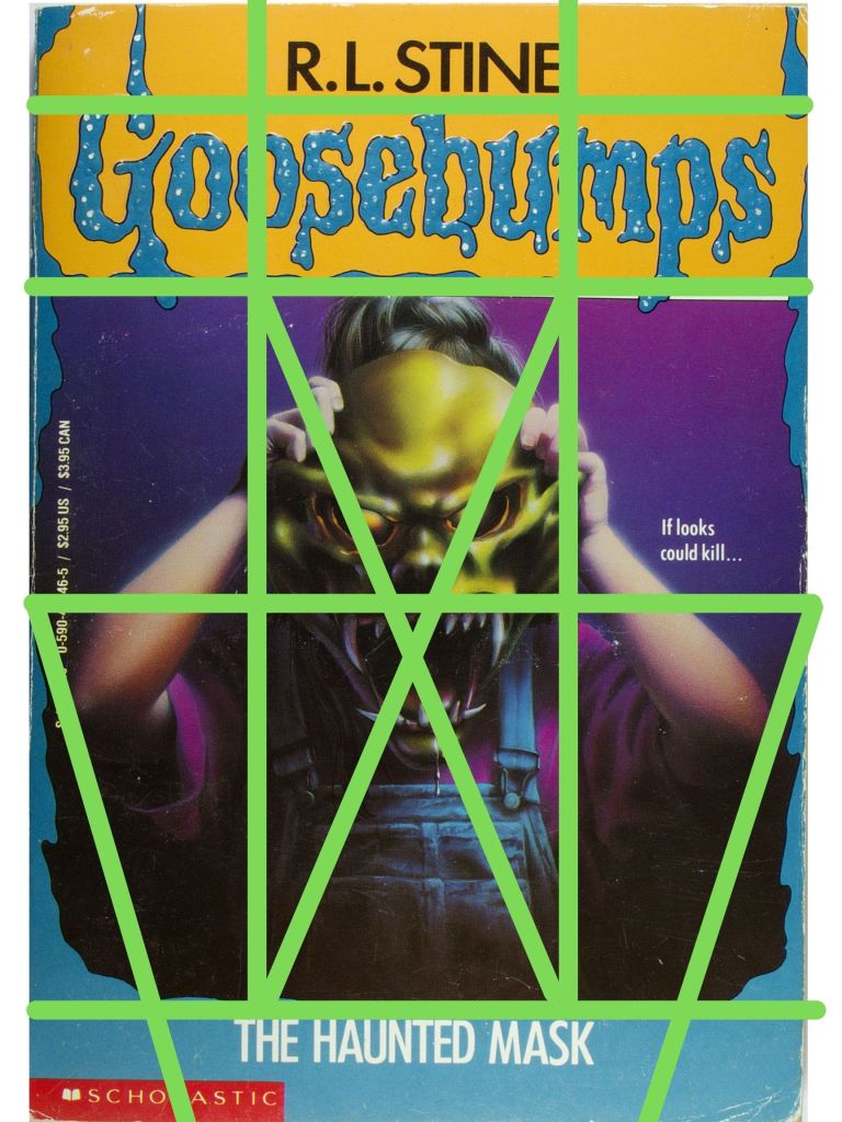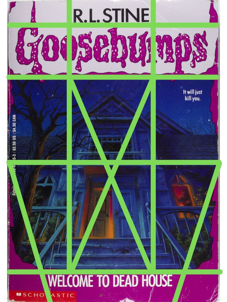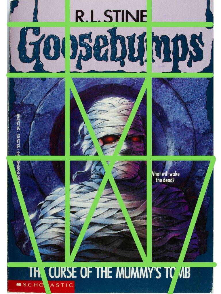 But to go even deeper than that, I wanted to dissect the covers of the Goosebumps series to see if there was a trend or pattern to them, similar to what Penguin publishing did with the Marber Grid in the 60s. Remember, excuse my lack of proper graphic design technique, but here’s what I found…