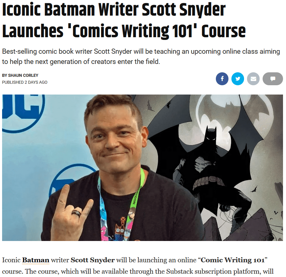 A great number of comic book writers and artists are leaving their jobs at the Big Two (Marvel and DC) and making their way over to Substack, basically starting their own company (I’m getting flashbacks to the Image Comics boom of the early 90s). These are lower level guys, these were all TOP NOTCH writers and pencilers and colorists and inkers and letterers leaving TOP LEVEL jobs to, basically, start out on their own.