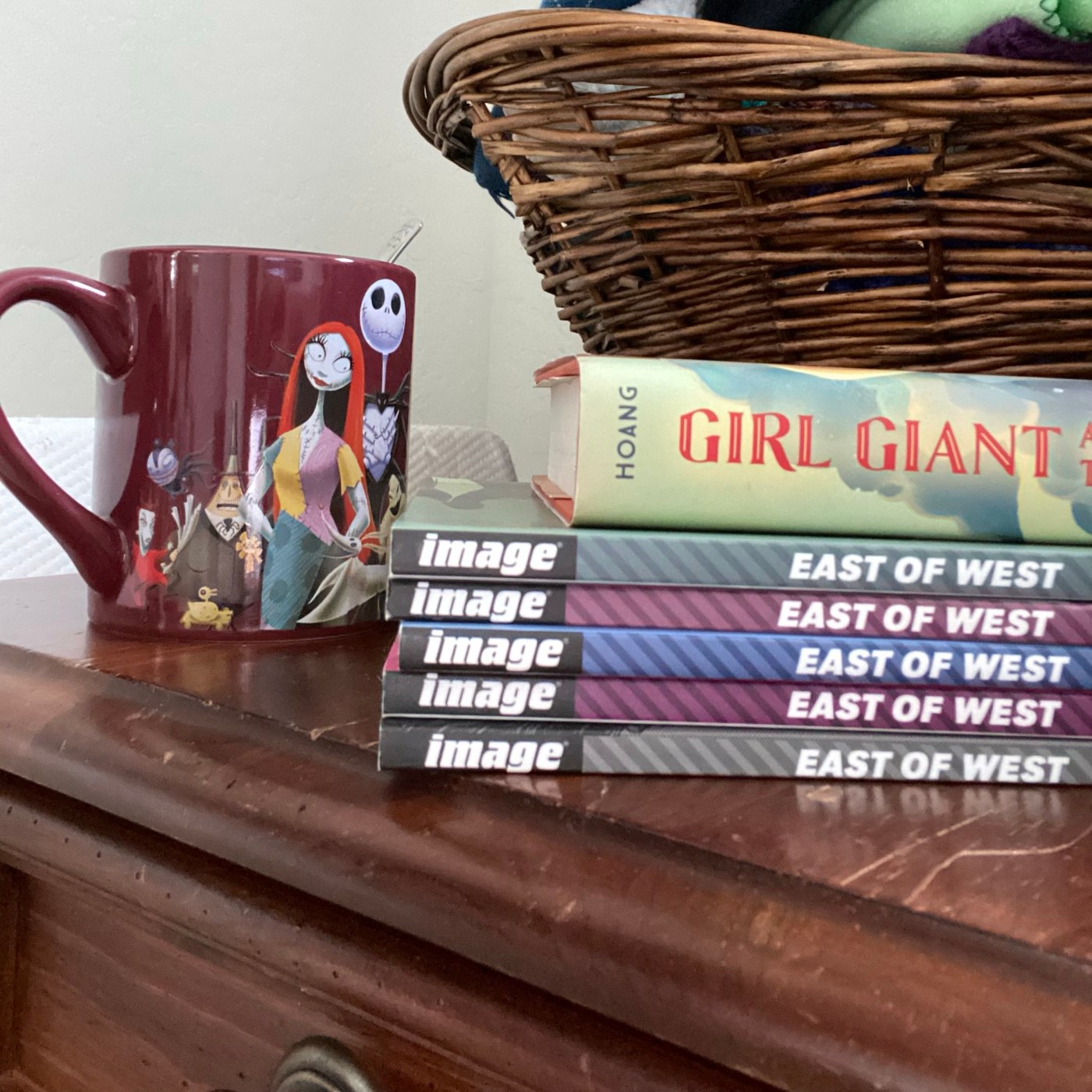 So my goal today is to burn off the last 50 pages of the AWESOME Girl Giant and the Monkey King and these first five volumes of Hickman and Dragotta’s East of West to get my to-read pile down before it collapses on my face while I’m sleeping.