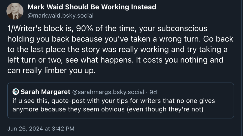 CLOUD – Still waiting to move ahead with this one. Mark Waid over on BlueSky just posted this piece of writing advice discussing writer’s block. I don’t remember if it’s his advice, or if he was referencing something else, but it was along the lines of “writer’s block usually means there’s something wrong with the story, either on the page or in your head.”