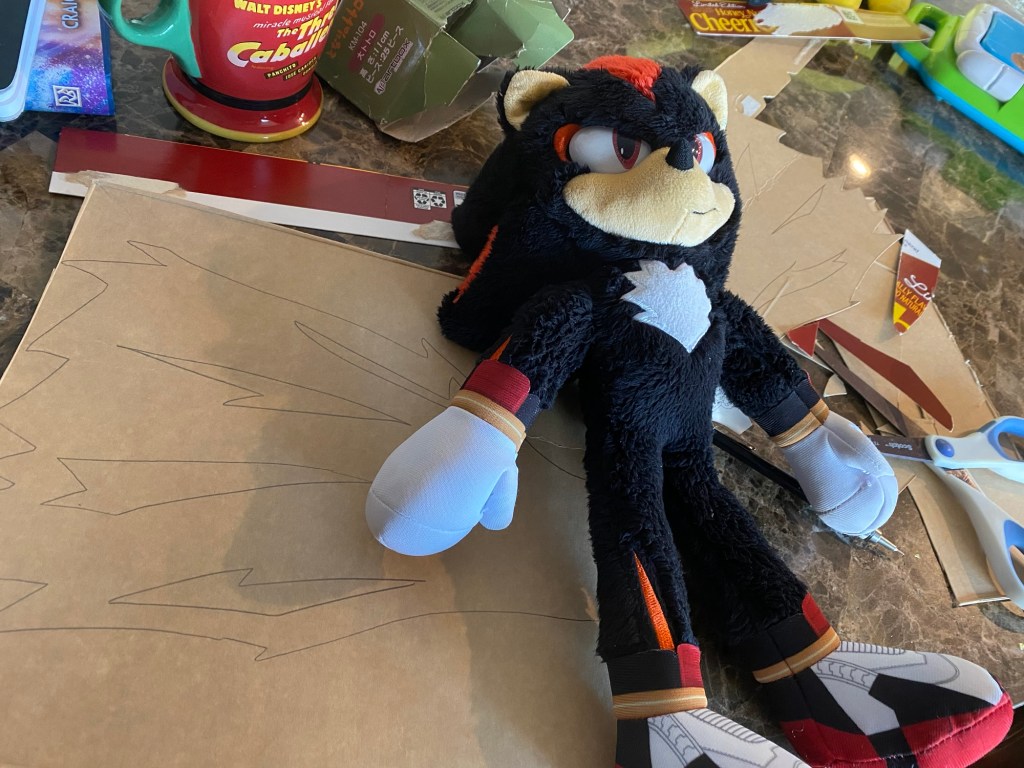 So yesterday afternoon, for whatever reason, I enlisted the help of Dante to help me create some Doom Wings for his Shadow the Hedgehog doll. Taken from the new Sonic x Shadow: Generations game, we grabbed a Honey Nut Cheerios box, I cut them out, Dante colored them in, and using some twine to make a backpack, we created a harness to slip on and off.