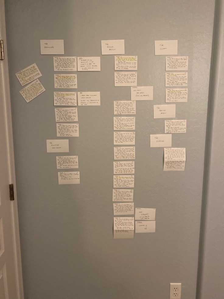 NESS – I moved all the note cards I made to help rewrite Project NESS upstairs to our bedroom (my new office space). I even repositioned them on the wall to assist in how I see the book.
