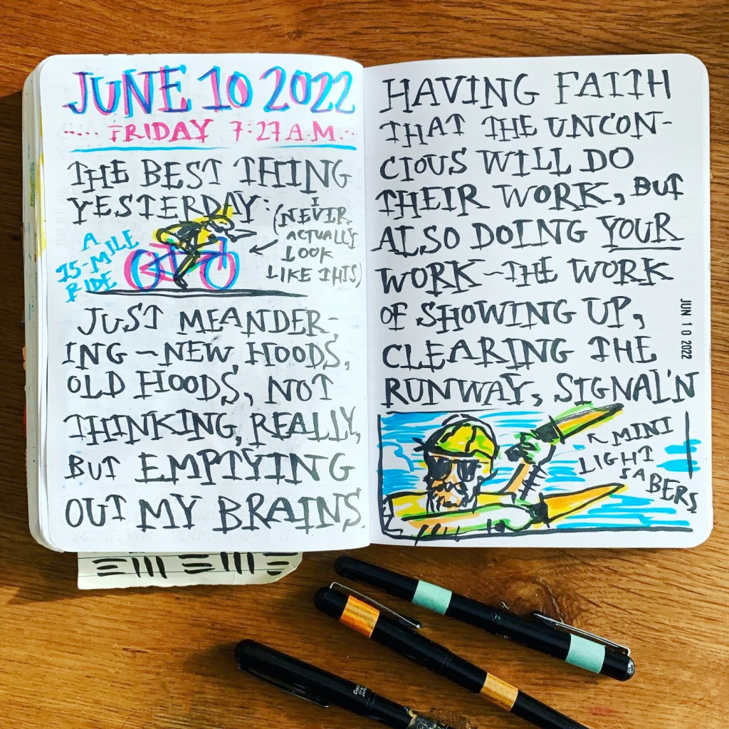 I’ve been borrowing from Austin Kleon’s journaling practice for my Morning Pages from time to time, when I don’t feel like doing my 500 or so words every morning. Seeing him use big, bold markers to get a point across gave me a pretty good out when those feelings crept in.